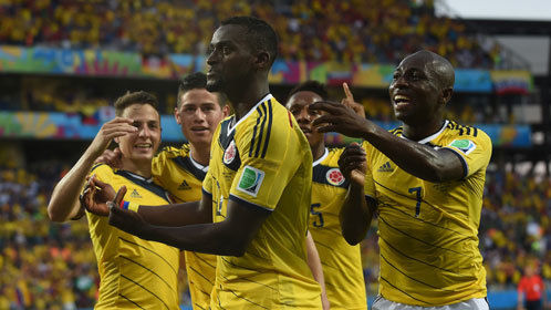 哥伦比亚球员将斯科米纳团团围住,门将奥斯皮纳情绪激动地摊开双手大声申诉,但判罚已不可更改。第6分钟,香川真司深吸一口气,助跑、停顿、推射右下角,皮球应声入网,哥伦比亚门将奥斯皮纳虽判断正确方向但角度太刁无力扑救。日本1-0领先,看台上的蓝色方阵沸腾了,日本球迷相拥而泣,挥舞着手中的“蓝色武士”旗帜-2。